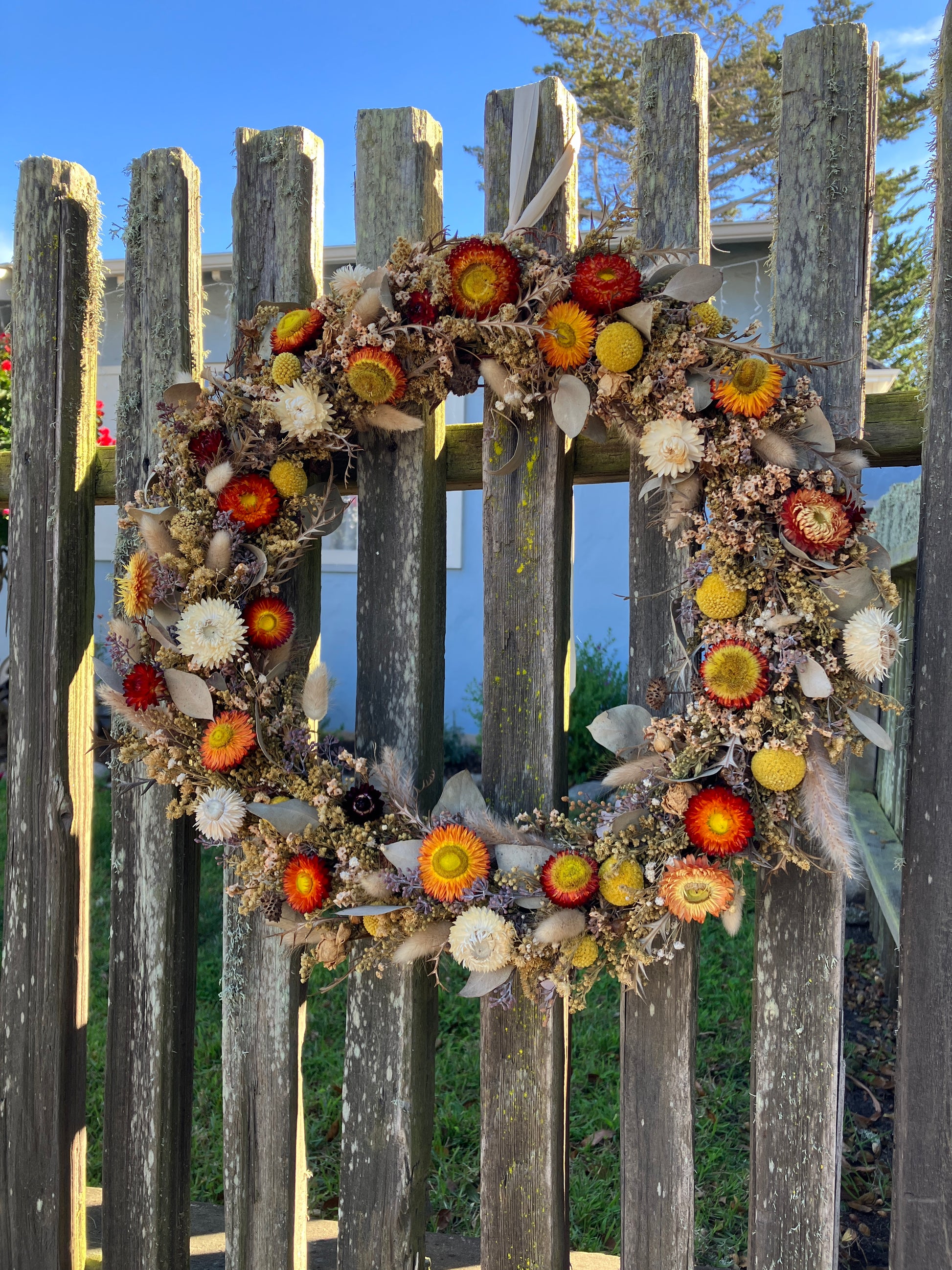 everlasting wildflowers on a grapevine wreath. large wreaths range from 17" - 20" in diameter. all wildflower wreaths come with a chiffon silk ribbon for hanging.